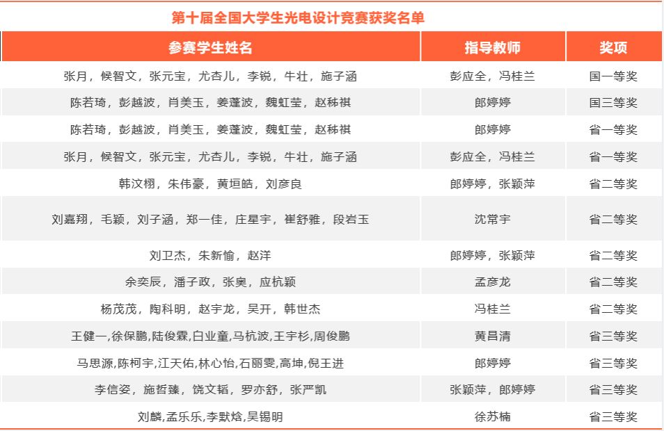 近日,第十屆全國大學生光電設計競賽國賽在華中科技大學圓滿結束,共有全國351所高校的2758個項目、17364名師生報名參加本屆競賽。我校學子努力拼搏,榮獲全國一等獎1項、三等獎1項,實現了國賽一等獎“零”的突破。在早期舉行的全國大學生光電設計競賽東部區賽中我校有由60名學生組成的11支隊伍獲獎,摘得省一等獎2項、二等獎5項、三等獎4項。