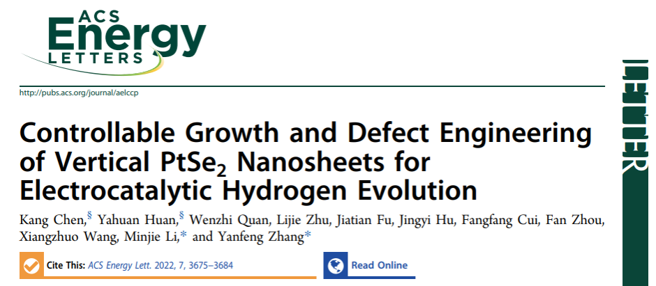 我校質量與安全工程學院李敏杰副教授與北京大學材料學院張艷鋒教授合作,在電催化水解析氫催化納米材料研究方面取得新進展。該成果于2022年10月以“Controllable Growth and Defect Engineering of Vertical PtSe2 Nanosheets for Electrocatalytic Hydrogen Evolution”為題發表在高水平國際學術期刊ACS Energy Letters (IF 23.991,中科院1區)上。第一作者為我校質量與安全工程學院2020級碩士研究生陳康。