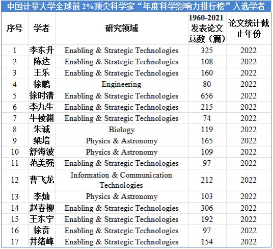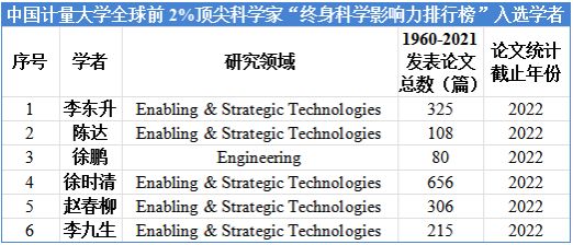 6位學者入選全球前2%頂尖科學家“終身科學影響力排行榜”,分別是:李東升、陳達、徐鵬、徐時清、趙春柳、李九生。