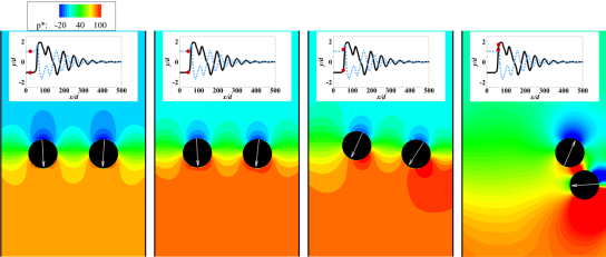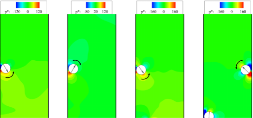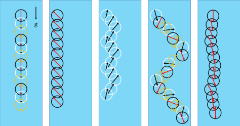 然而,耦合自驅(qū)動顆粒與流體的相互作用研究依舊是一個新的領(lǐng)域,許多機理性問題尚不明確。基于此,論文作者采用了自驅(qū)動顆粒模型—Squirmer游動速度方程,并通過格子Boltzmann方法模擬了它們在重力場中的運動行為及相互作用。論文不僅揭示了自驅(qū)動顆粒的5種典型運動模式(圖3),而且詳細闡述了自驅(qū)動顆粒之間的相互吸引、排斥及同步振動的機制(圖4)。特別地,論文針對自驅(qū)動顆粒在壁面附近的行為進行了細致分析,從顆粒周圍的壓力分布及其導致的顆粒受力(力矩)角度來闡明其與壁面的相互作用機理(圖5),這不僅為某些微生物在壁面附近的活動行為提供了合理解釋,而且為重力感應(yīng)人工智能化顆粒的設(shè)計提供了理論指導。