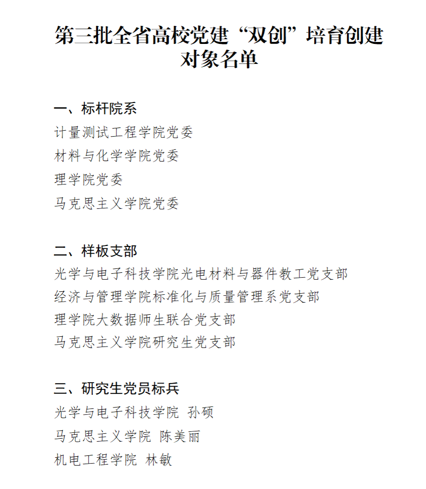 根據《中共浙江省委教育工作委員會辦公室關于開展第三批全省高校黨建“雙創”培育創建工作的通知》,經學校申報、綜合遴選、省教育廳黨組會審議和公示等程序,確定10個高校黨委、150個院系黨組織、151個基層黨支部、50名研究生黨員為第三批全省高校黨建“雙創”培育創建對象。我校計量測試工程學院黨委、材料與化學學院黨委、理學院黨委、馬克思主義學院黨委4個院系黨委入選全省高校黨建工作標桿院系,光學與電子科技學院光電材料與器件教工黨支部、經濟與管理學院標準化與質量管理系黨支部、理學院大數據師生聯合黨支部、馬克思主義學院研究生黨支部入選全省高校黨建工作樣板支部,機電工程學院林敏、光學與電子科技學院孫碩、馬克思主義學院陳美麗入選全省研究生黨員標兵榮譽稱號。學校本次共申報了11項,全部獲得立項。