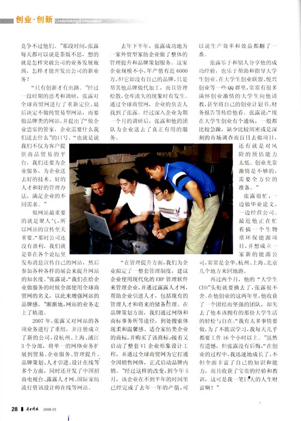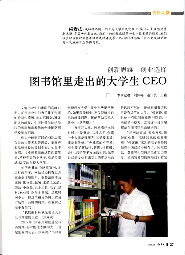 《中國核心期刊(遴選)數據庫》收錄期刊《今日科技》在2008年第5期的“創業?創新”版塊的“創新人物”欄目中,以較大篇幅、圖文并茂地刊發了題為《圖書館里走出的大學生CEO》一文,生動介紹和報道了我校法學院大四畢業生張露的創業故事。