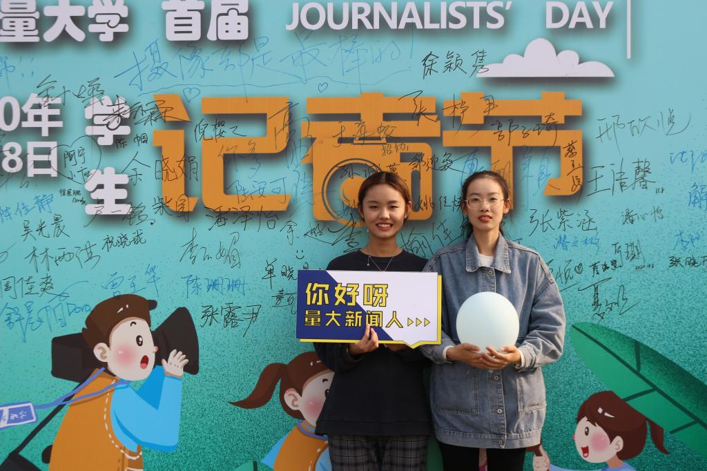 “聞訊而啟,視潮而動,逐浪而行。記者節快樂!”“妙筆傳量文,熱血發量聲。”“用文字記錄時光,用鏡頭鏈接現場,用創意點亮生活?!眴⒚鲝V場兩側的橫幅為活動提前預熱?!皩懴旅?,就意味著一份承諾。”中國計量大學融媒體中心成員、18動檢1班的陳幗說。同學們紛紛在巨大的噴繪上鄭重寫下自己的名字,拿著“記者節,我們的節日”“你好呀,量大新聞人”等手牌在簽名墻前拍照留念,洋溢著滿滿的熱情。