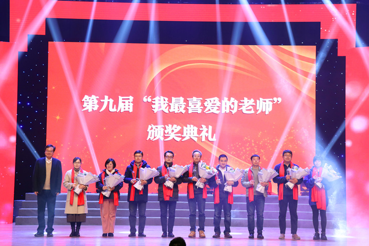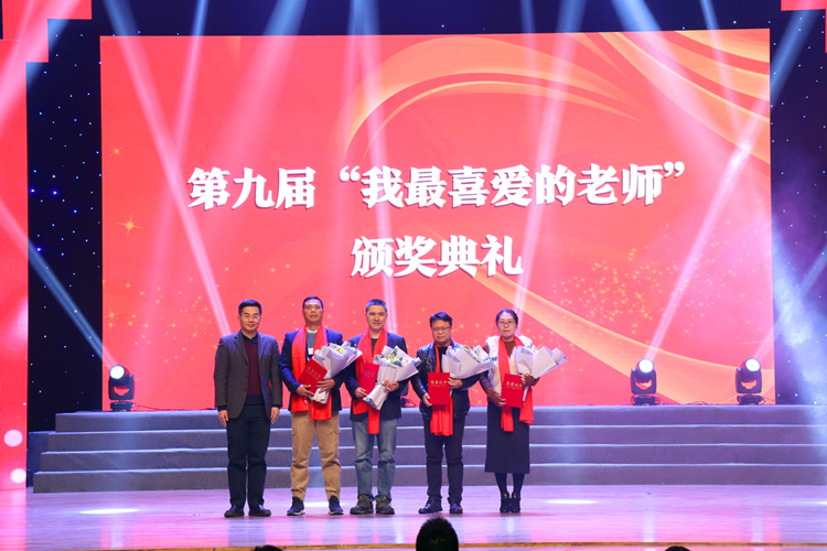 晚會(huì)開(kāi)場(chǎng)后首先舉行第九屆“我最喜愛(ài)的老師”頒獎(jiǎng)儀式。為營(yíng)造尊師重教的良好氛圍,增強(qiáng)同學(xué)們的主人翁意識(shí),增進(jìn)廣大同學(xué)與老師之間的感情,校學(xué)生會(huì)于近期組織開(kāi)展了第九屆“我最喜愛(ài)的老師”評(píng)選活動(dòng),經(jīng)過(guò)各教學(xué)單位推薦和黨組織同意,組委會(huì)進(jìn)行資格審查,綜合候選老師公開(kāi)課學(xué)生評(píng)審評(píng)分與任課班級(jí)抽樣評(píng)分并進(jìn)行獲獎(jiǎng)公示等環(huán)節(jié),最終產(chǎn)生了“我最喜愛(ài)的老師”10名,單項(xiàng)獎(jiǎng)7名。程剛為“我最喜愛(ài)的老師”獲得者頒獎(jiǎng),王斌銳為“我最喜愛(ài)的老師”單項(xiàng)獎(jiǎng)獲得者頒獎(jiǎng),學(xué)生代表向獲獎(jiǎng)教師獻(xiàn)花致敬。