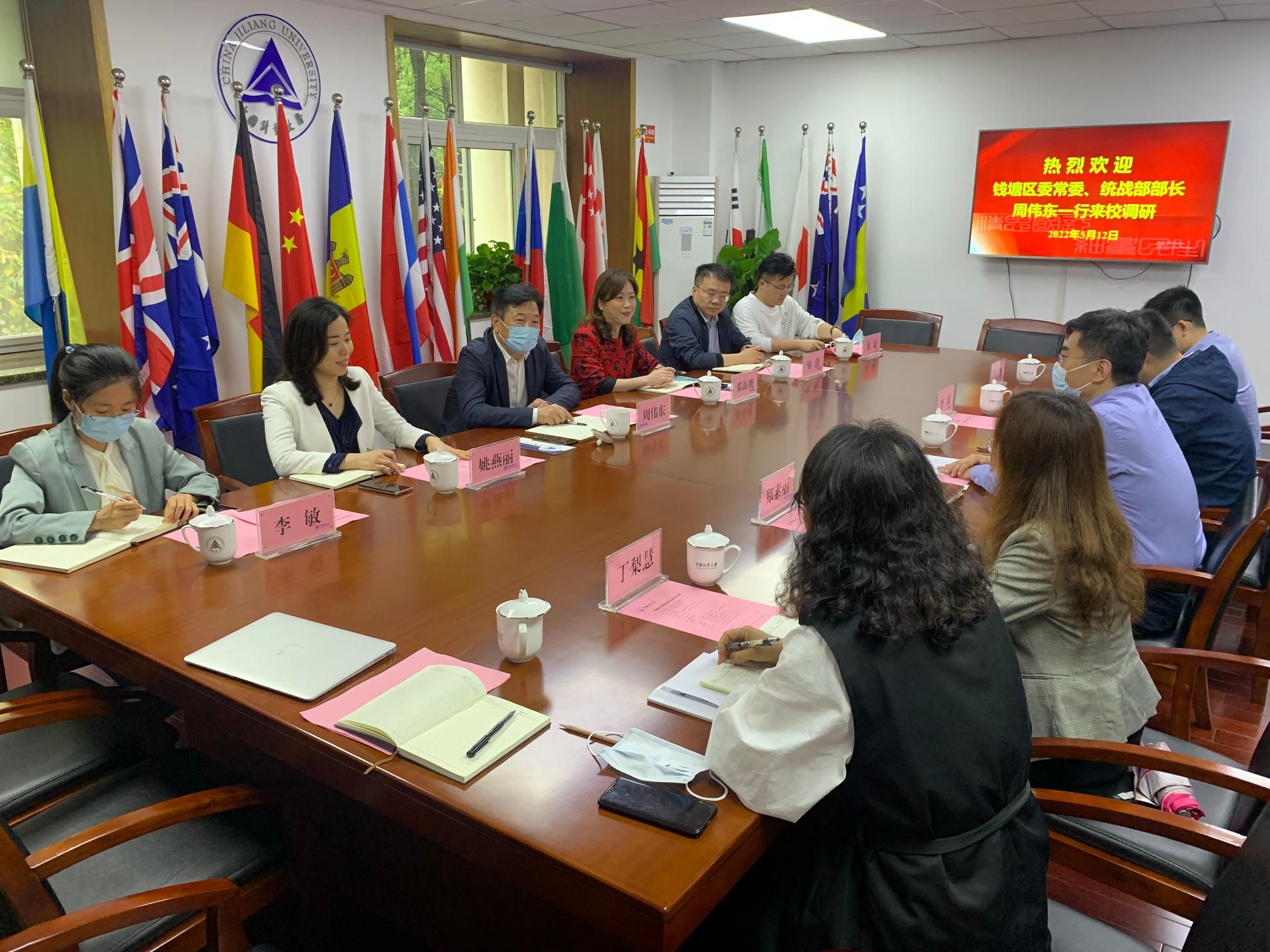 5月12日下午,錢塘區委常委、統戰部部長周偉東,區委統戰部副部長、區工商聯黨組書記鄧海鷹,區委統戰部副部長姚燕麗等來校調研座談。校黨委委員、統戰部部長王斌銳和經濟與管理學院、對外聯絡處、資產經營有限責任公司等有關單位出席會議。
