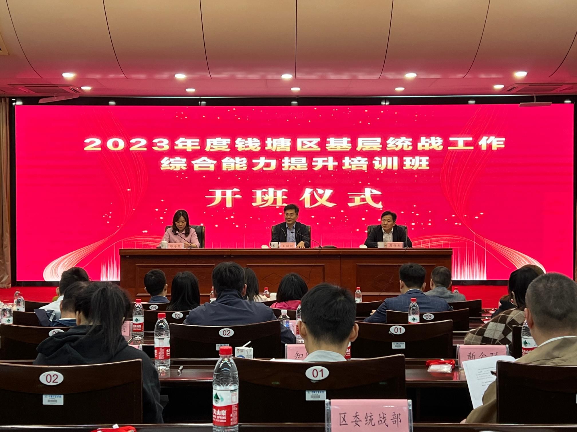為深入學習貫徹習近平新時代中國特色社會主義思想,提高錢塘區統戰基層干部的統戰工作綜合能力,11月8日上午,2023年度錢塘區基層統戰干部綜合能力提升培訓班在我校聞廳報告廳開班。中國計量大學黨委委員、副校長王斌銳,錢塘區委常委、統戰部部長周偉東出席本次開班儀式。儀式由錢塘區委統戰部副部長、錢塘區工商聯黨組書記鄧海鷹主持,來自錢塘區基層統戰干部80余人參加培訓。